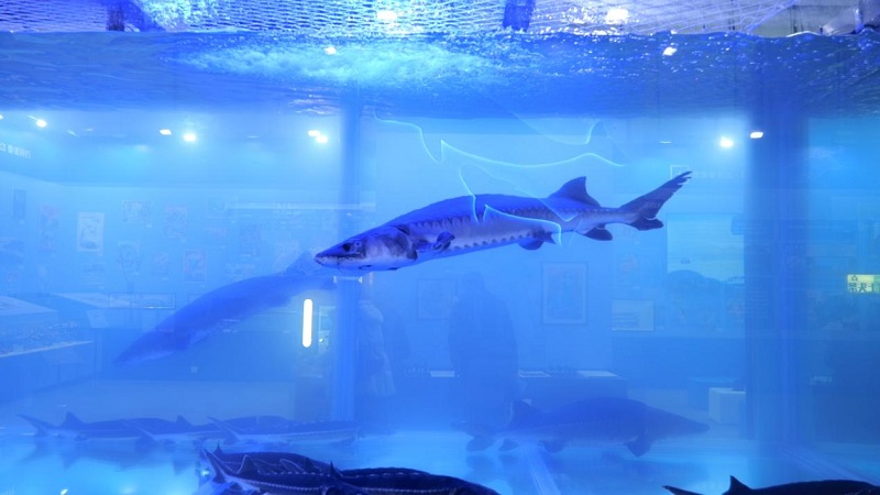 在全国农业展览馆5号馆举办的“长江禁渔五年展”西侧大厅正中间,摆放着一个长8米、宽1.7米的“大鱼缸”,在这里可以近距离观看珍稀物种中华鲟、长江鲟。