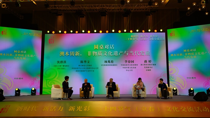 在圆桌对话环节,浙江师范大学教授、中国民俗学会立春文化研究中心主任、国家非遗保护专家库专家陈华文,文化和旅游部原副部长项兆伦,中国民俗学会常务理事、中国乡愁文化发展中心主任李春园,浙江教育出版社集团党委副书记、总编辑蒋婷等围绕“溯本铸新,非物质文化遗产与当代发展”主题,就二十四节气在乡村振兴、生态文明与当代生活中的现实意义展开交流。